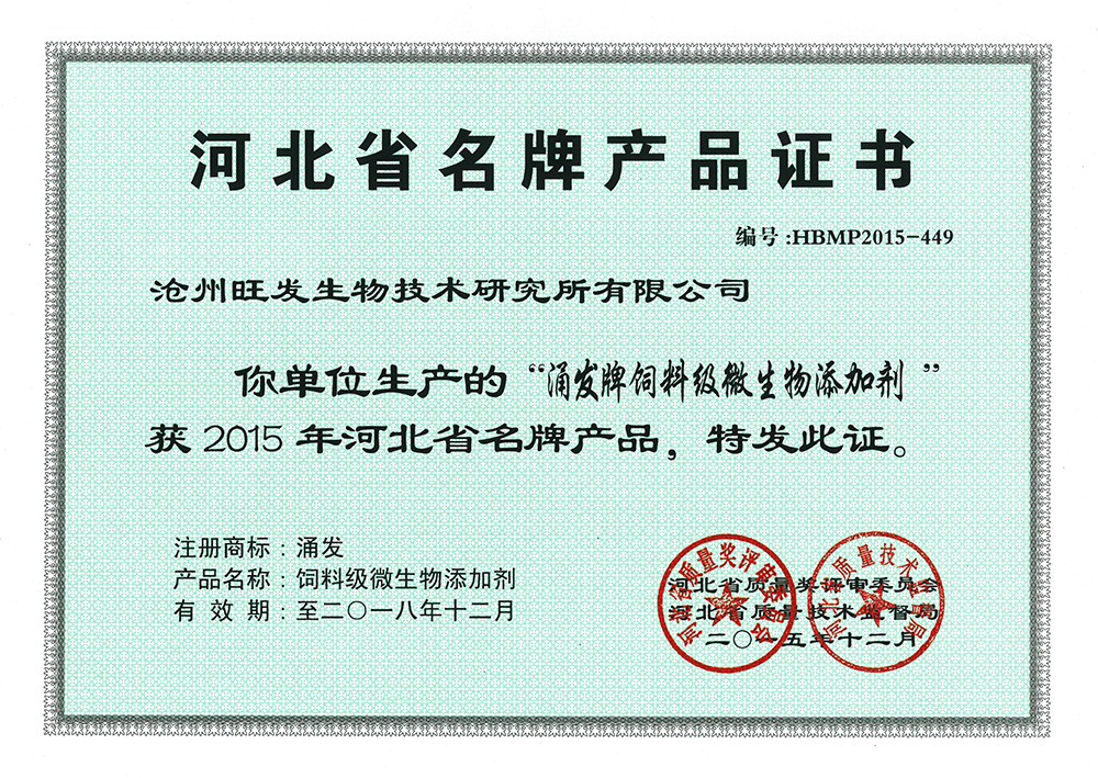The Hebei provincial quality and Technical Supervision Bureau and the Hebei Quality Award evalsuation Committee Office awarded the honorary title of our company's "famous brand products of Hebei in 2015". The Yongfa feed microbial feed additive produced by the company has won the honor by virtue of its brand strength, excellent quality assurance and good reputation in the market.